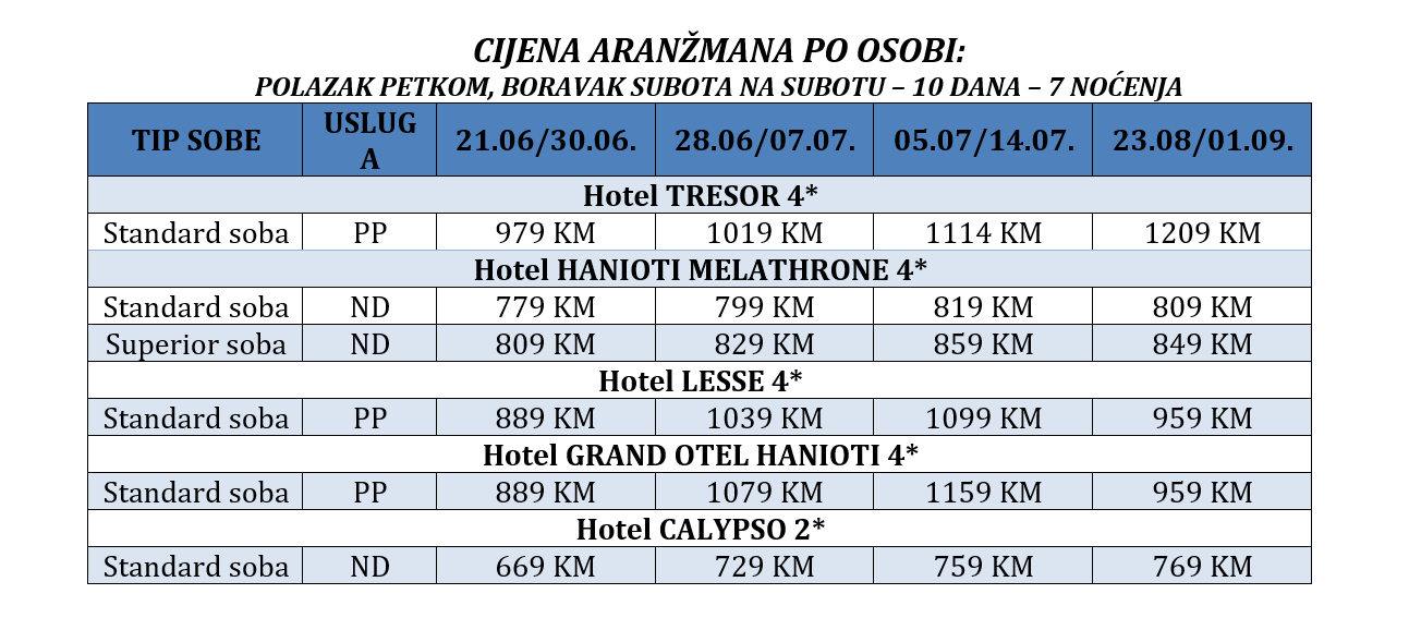 se nalazi na oko 800 metara od Haniotija. Gradska pješčano-šljunkovita plaža nalazi se na oko 150 metara udaljenosti i do nje se dolazi uskim seoskim putem. Ležaljke i suncobrani na plaži dodatno se plaćaju na licu mjesta. Kompleks se sastoji od nekoliko trospratnih zgrada koje su raspoređene po predivnom vrtu. Zbog svoje odlične usluge i gostoljubivih domaćina ovo je jedan od najtraženijih hotela na našem tržištu za sve one koji žele odličan odmor uz povoljne cijene. Gostima hotela na raspolaganju su sljedeći sadržaji: recepcija koja radi 24h, prodavnica, besplatan wi fi na javnim površinama hotela, vrt, kompleks tri međusobno povezanih bazena koji imaju i poseban dio za djecu, igralište za djecu, restoran, bar, bar pored bazena i raznovrsni zabavni sadržaji. Hotel nema lift. SOBE: standard soba – veličine je oko 30m2m i u njoj je jedan francuski krevet ili dva odvojena kreveta i dodatno kauč ili sofa na razvlačenje. Usluga u hotelu je polupansion (doručak i večera).